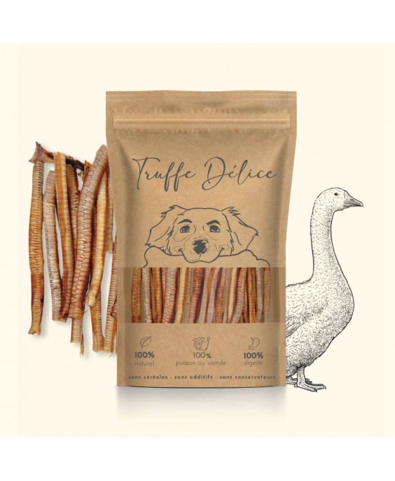 Skanus būdas pasirūpinti augintinio judrumu! Truffe Délice džiovintos žąsų trachėjos yra 100 % natūralus skanėstas, kuriame gausu natūralaus gliukozamino ir chondroitino. Šios medžiagos yra gyvybiškai svarbios sveikoms kremzlėms ir sąnariams palaikyti. Dėl savo traškios tekstūros ir hipoalerginių savybių, tai idealus kramtalas visų dydžių šunims, ypač turintiems jautrų virškinimą.