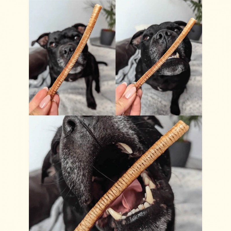 - Nepalikite šuns su skanėstu be priežiūros. Visada prižiūrėkite šunį kramtymo metu. Kadangi trachėjos yra tuščiavidurės, jos traškios, tačiau kramtant gali skilti į mažesnius gabalėlius – įsitikinkite, kad šuo juos gerai sukramto.